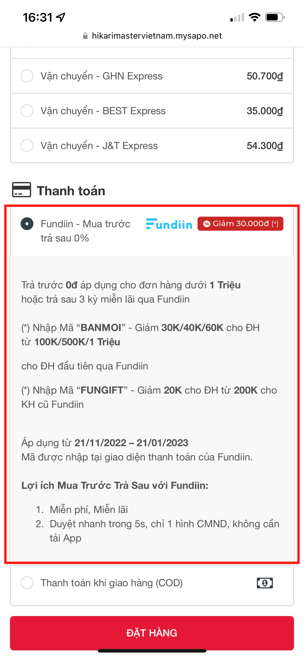 HƯỚNG DẪN MUA HÀNG TẠI WEBSITE HIKARI MASTER VÀ THANH TOÁN LẦN ĐẦU QUA FUNDIIN:
