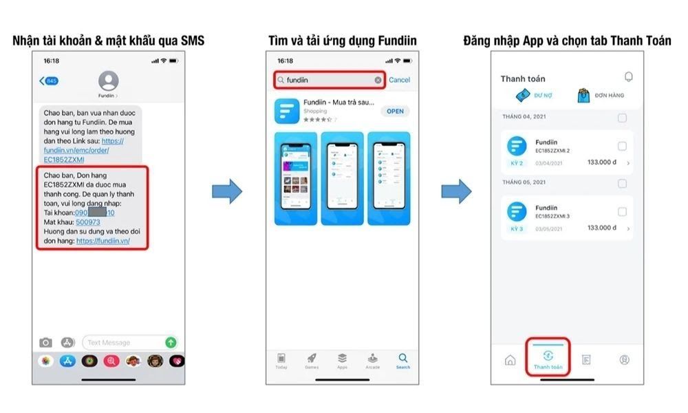 Bước 3: Nhận SMS từ Fundiin để tạo tài khoản và thanh toán ⅓