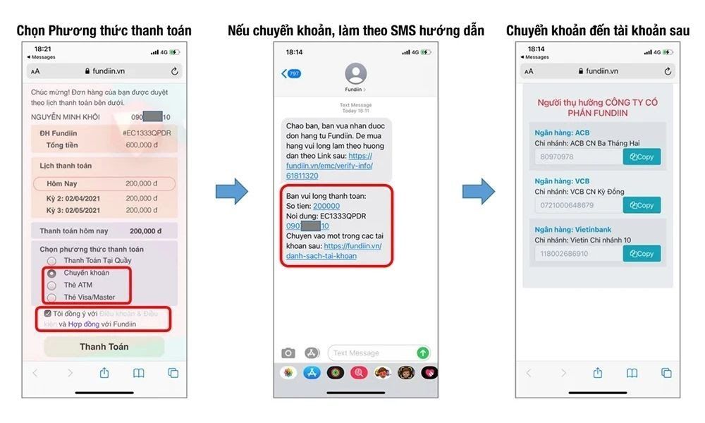 4. Khách hàng là chủ sở hữu của thẻ ngân hàng (thẻ ATM, thẻ ghi nợ, thẻ tín dụng, Visa, Mastercard) hoặc có thể chuyển khoản tại ngân hàng hoặc chuyển khoản online 3 kỳ cho Fundiin.
