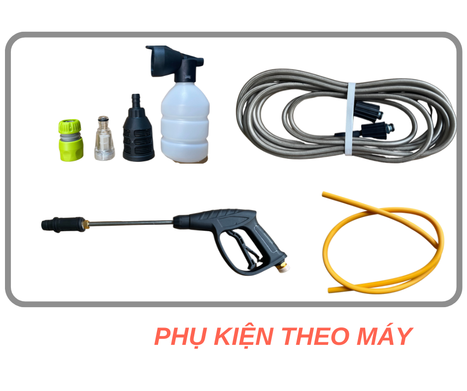 Phụ kiện theo máy: Dây rửa xe 10m, bình bọt, súng dài đồng, dây hút nước, phụ tùng...